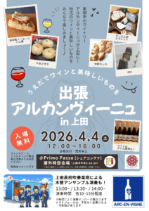 2026年4月4日(土)12:00~16:00、上田市 Primo Passo【シェアコンテナ】屋外特設会場にて、アルカンヴィーニュによるイベント「出張アルカンヴィーニュ in 上田 ~うえだでワインと美味しいものを~」を開催します。